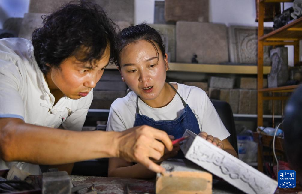 倪朋辉与妻子陈芳在工作室一起探讨砖雕创作构思(8月25日摄)。