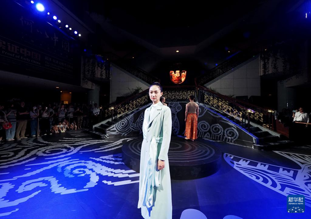 8月25日晚,模特在上博“研色·良渚之夜”综合艺术秀上展示时装。