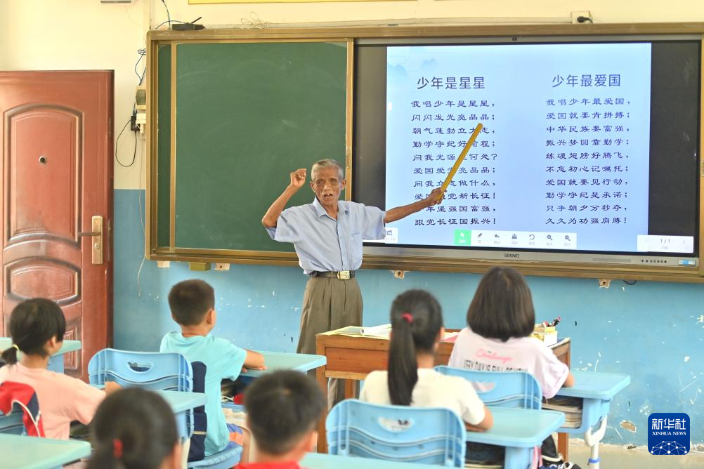 在梧州市长洲区长洲镇泗洲小学,陈明仲在教孩子们唱下俚歌(9月5日摄)。