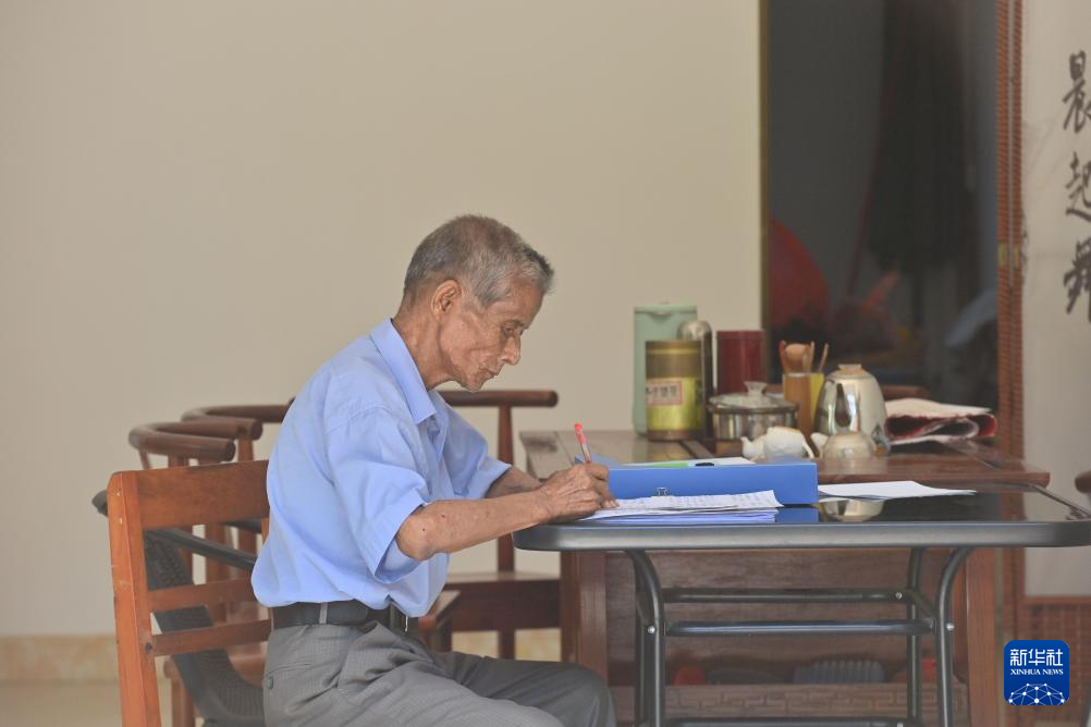 在梧州市长洲区长洲镇泗洲村的家中,陈明仲在整理自己创作的下俚歌词文稿(9月5日摄)。