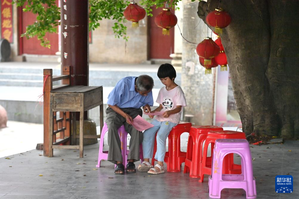 在梧州市长洲区长洲镇泗洲村,陈明仲(左)在教小学生唱下俚歌(8月24日摄)。