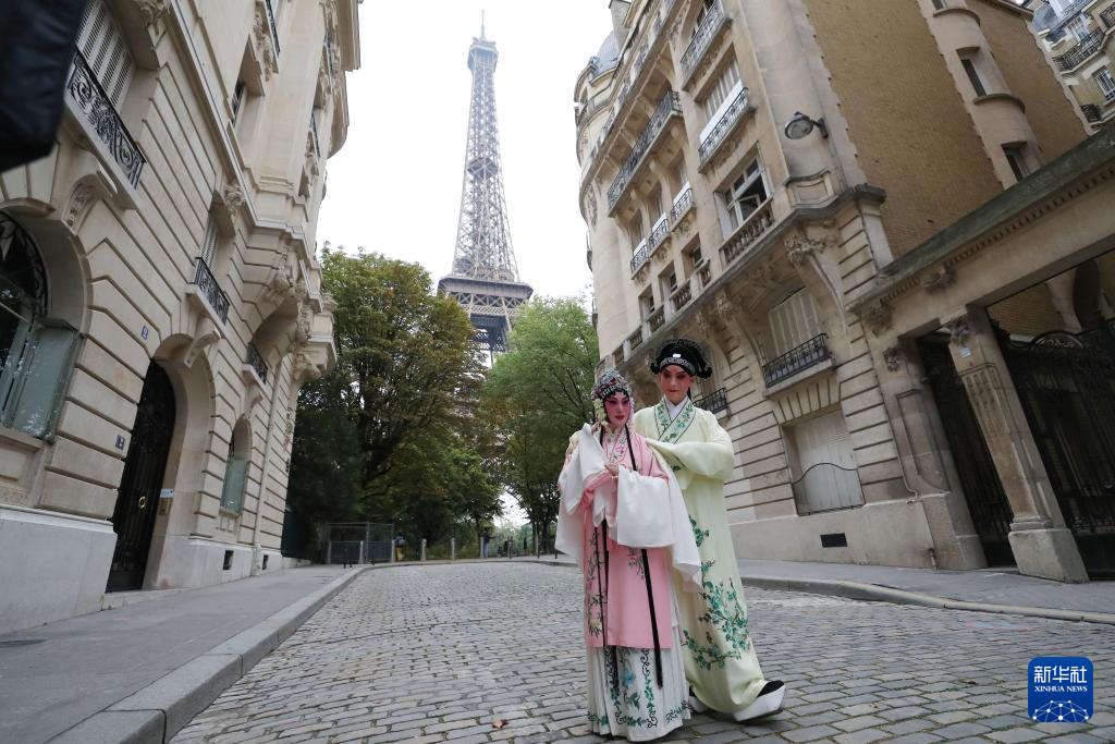 9月13日,江苏省演艺集团昆剧院院长施夏明(右)和江苏省演艺集团昆剧院国家一级演员孔爱萍在法国巴黎埃菲尔铁塔附近参加昆曲快闪。
