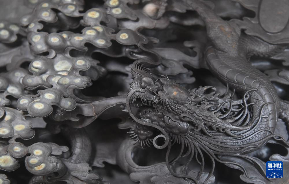 这是柳新祥端砚作品雕刻的飞龙形象及端砚独特的石眼(10月25日摄)。