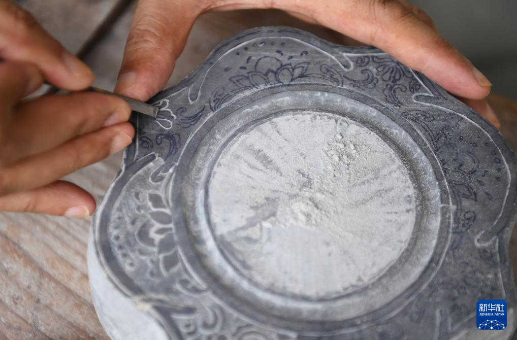 10月26日,在广东肇庆柳新祥端砚艺术馆的工作室,柳新祥在端砚上精雕细琢。