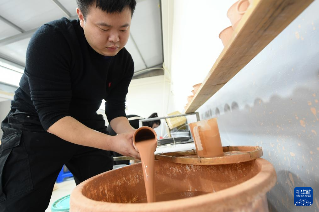 10月31日,在“梅夫人”工作室,季双俊给瓷坯上釉。