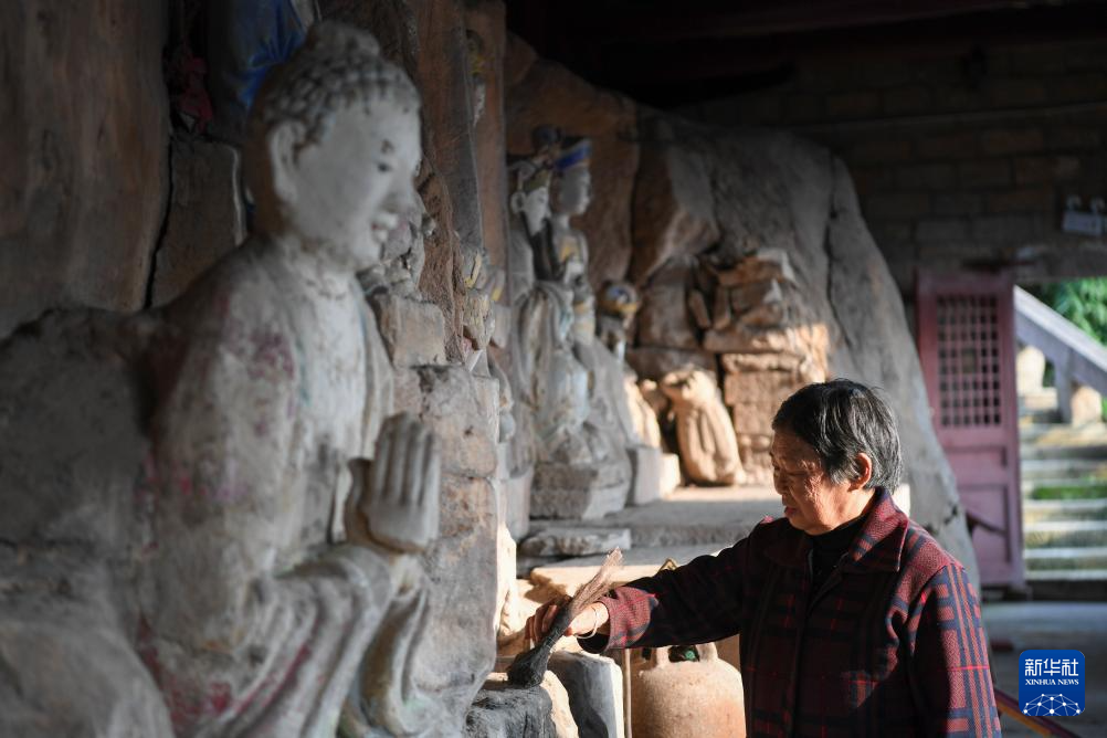 10月31日,在重庆市大足区中敖镇金盆村,义务文保员在普圣庙摩崖造像文物保护点打扫卫生。