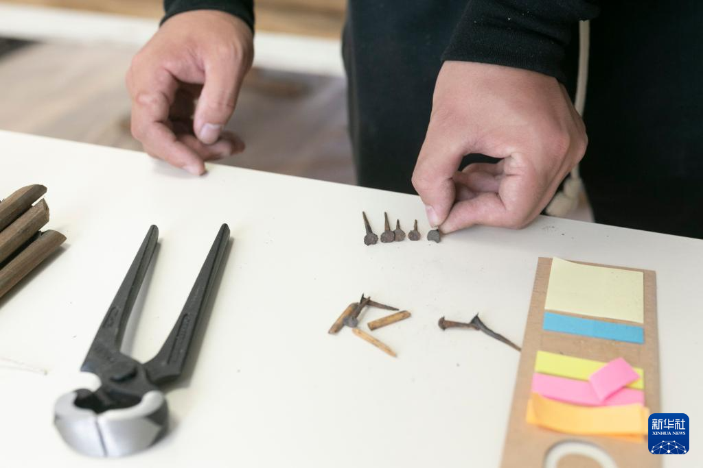 这是10月16日在斯洛文尼亚卢布尔雅那的民族志博物馆拍摄的中国古建筑木质大门模型上的钉子。