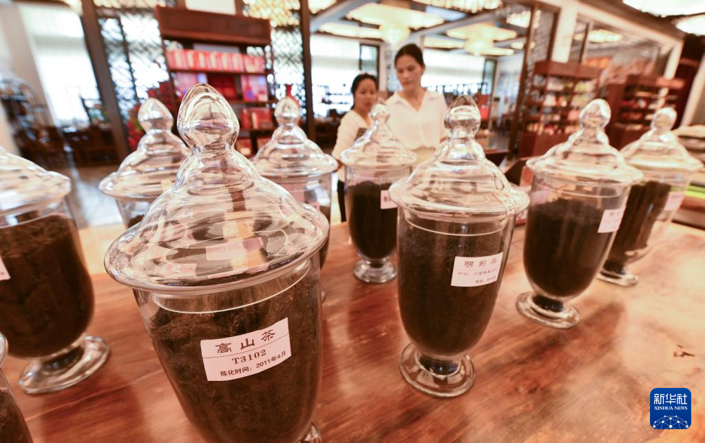 在梧州市天誉茶业有限公司产品展示厅,消费者在选购陈年六堡茶(8月25日摄)。
