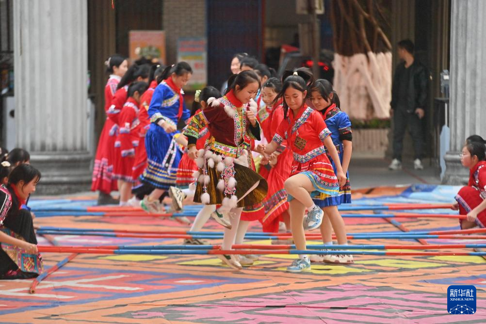 12月28日,在柳州市融安县实验小学,学生们在跳竹竿舞。