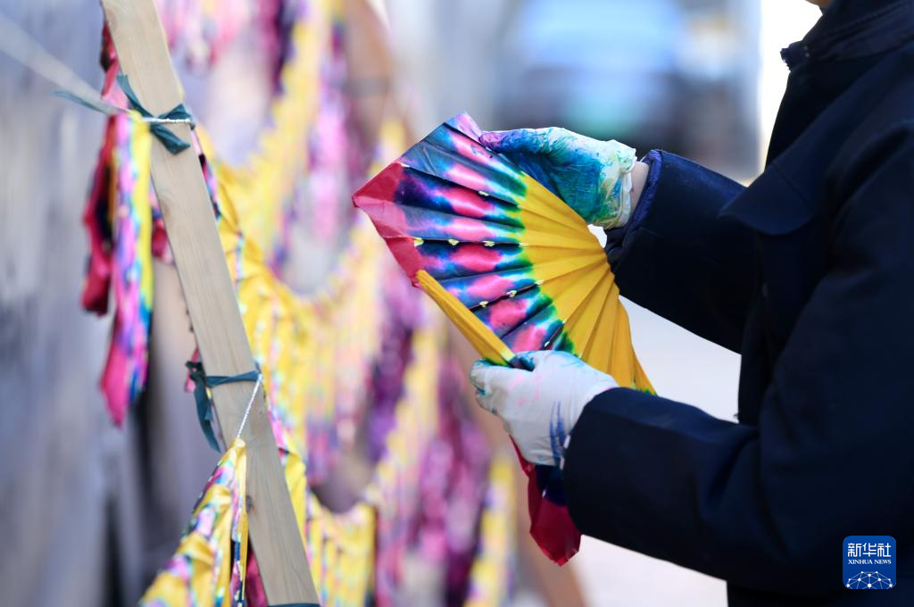 1月24日,在石家庄市栾城区邵家庄村,手工艺人在晾晒彩子。
