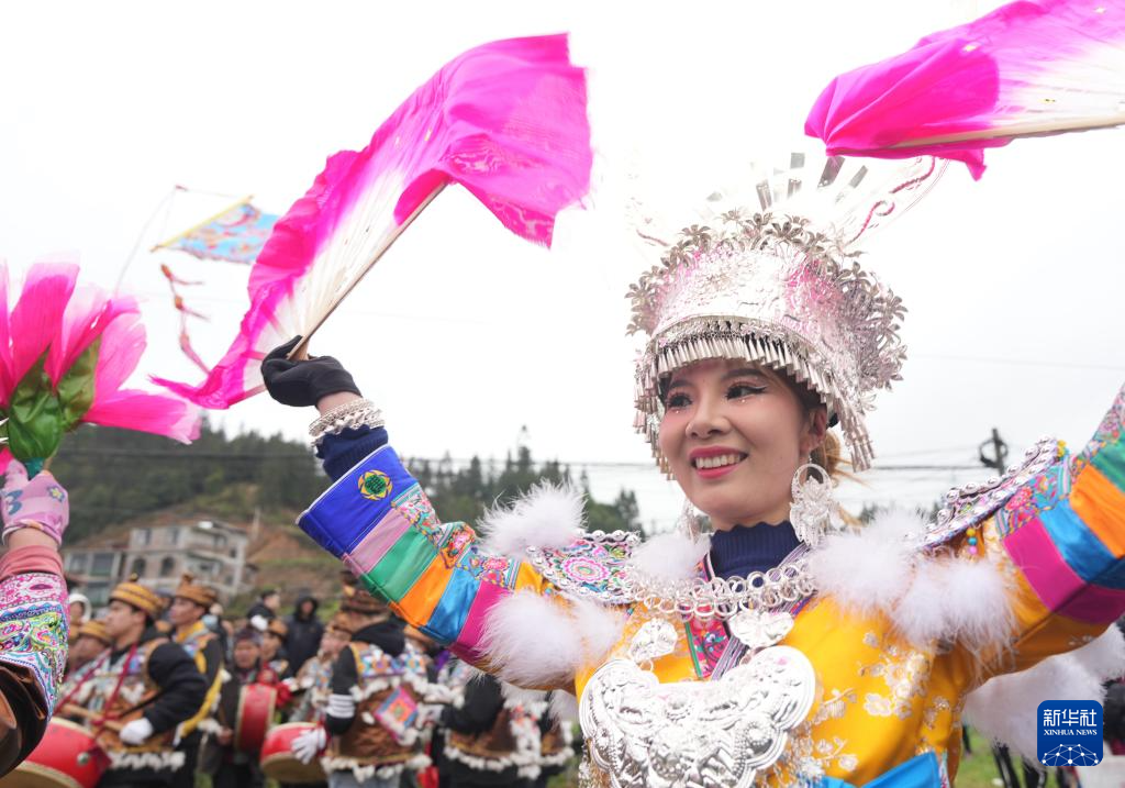2月22日,村民在广西柳州市融水苗族自治县安太乡举行的正月十三坡会上表演(无人机照片)。