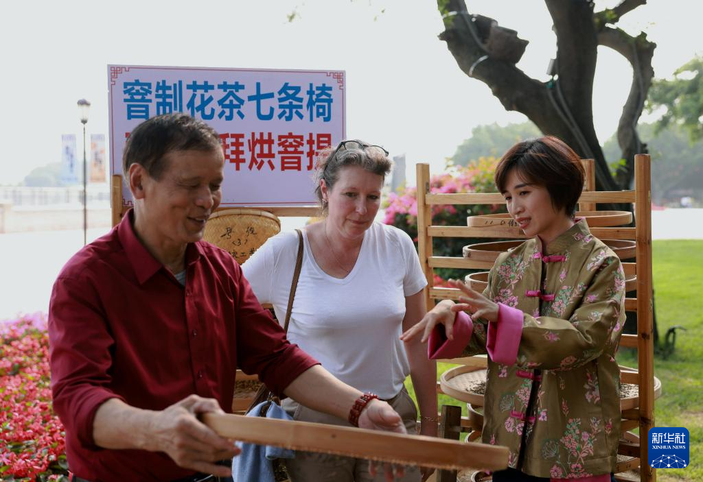 4月14日,在福州茉莉花文化体验馆,非遗技艺传承大师为福州外国语学校与姊妹校巴黎斯坦尼斯学校的师生讲解展示福州茉莉花茶窨制工艺。