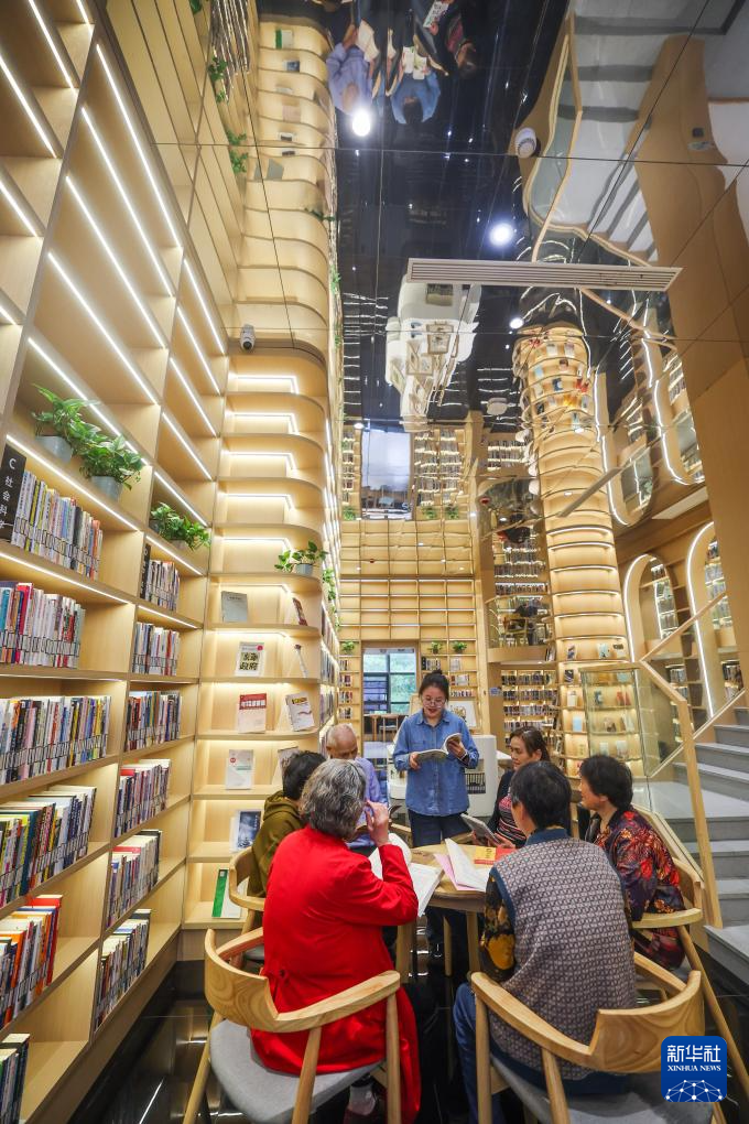 4月16日,在嘉兴市南湖区东栅街道南江社区智慧书房的二楼阅读区,党员志愿者给老年人举办科学养生的主题读书会。