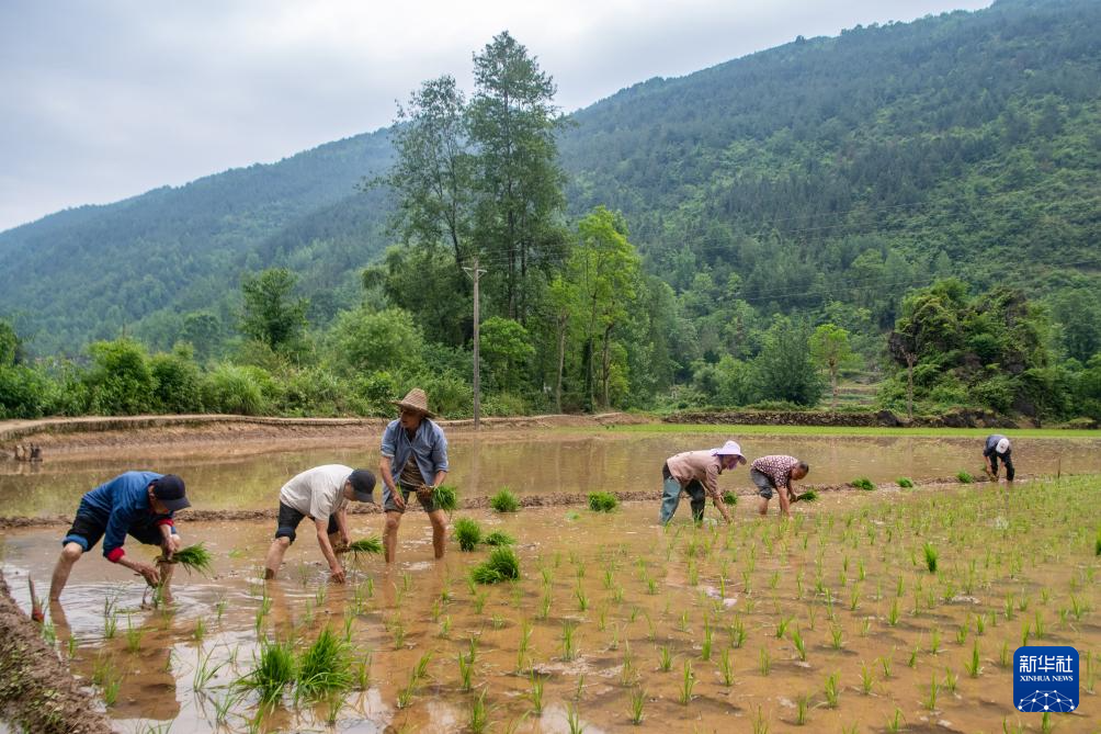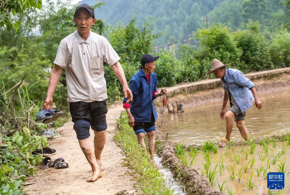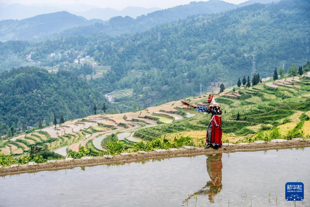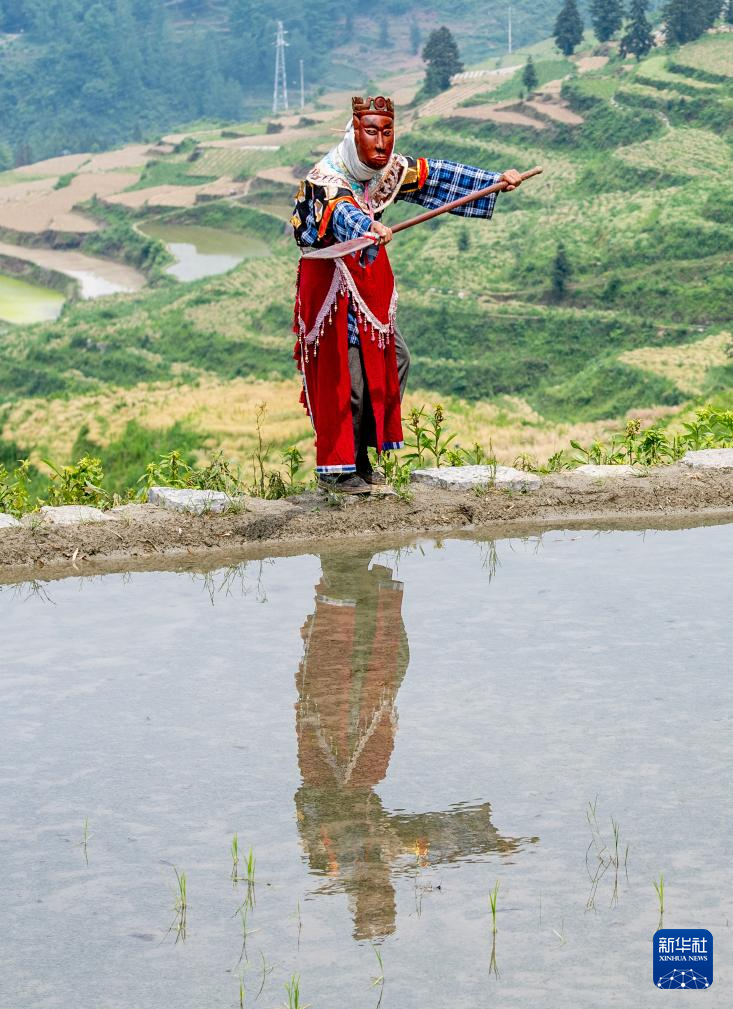 山环水抱的清泉村,海拔约千米。小满前后正是当地农忙插秧的时节。在一群头发花白的稻农中,阳戏艺人陈永霞、冷定祥、石茂昌、杨翠红、李兵、许霞章正躬身水田中熟练地插秧。对于世代生活在这片大山里的土家族村民来说,农事劳作是刻在他们骨子里的生存技能。