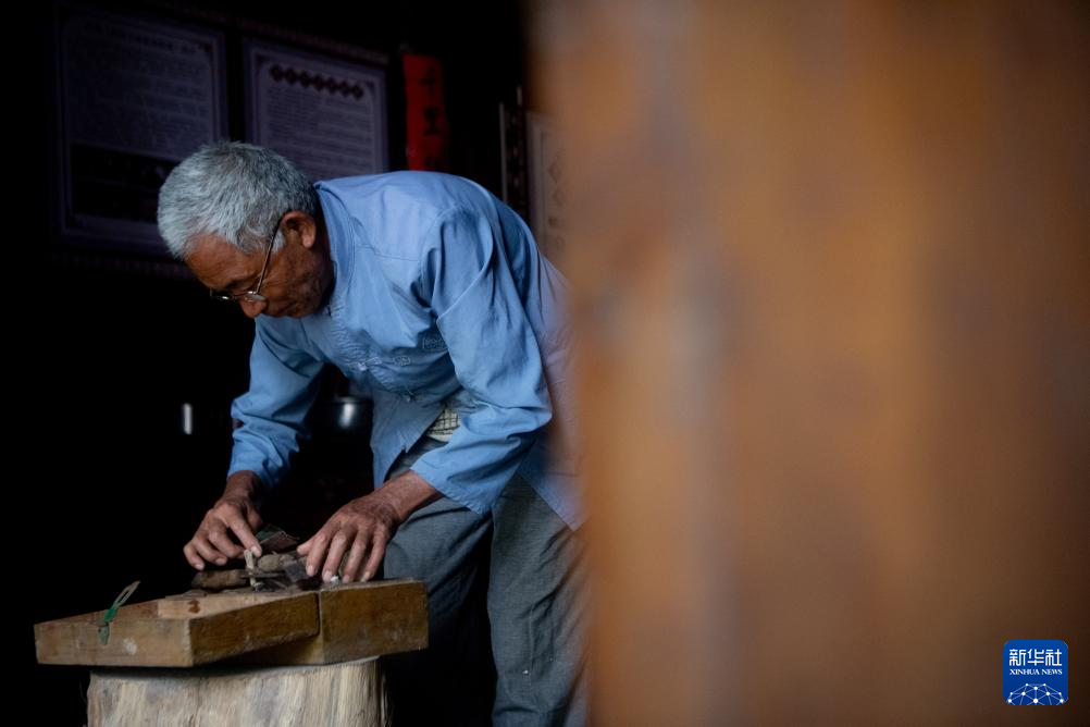 5月16日,陈永霞在整理阳戏面具的雕刻工具。
