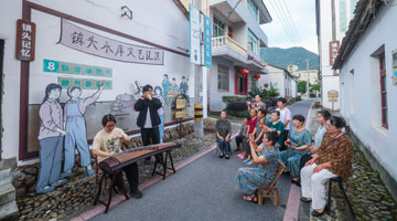 6月15日,杭州师范大学音乐学院的学生(左一、左二)在三都镇镇头村为村民即兴演出。