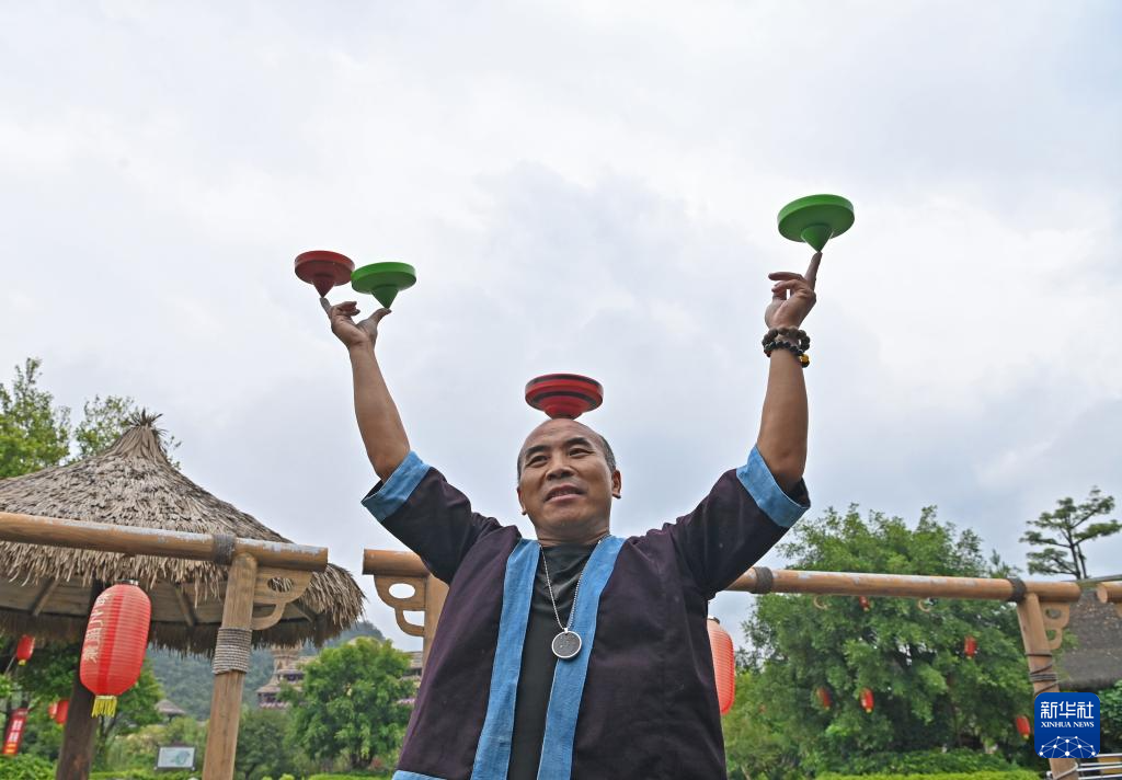 何光斌在南丹县里湖瑶族乡朵努社区展示指尖陀螺(8月30日摄)。