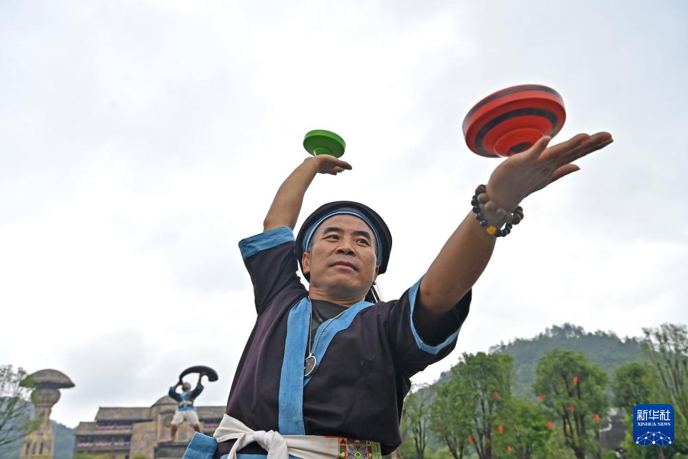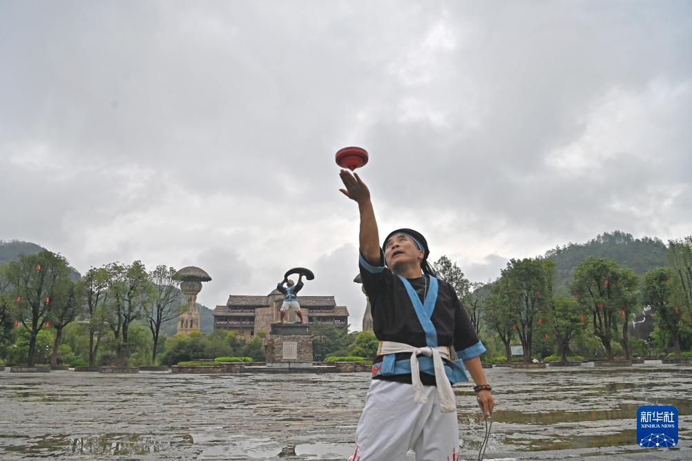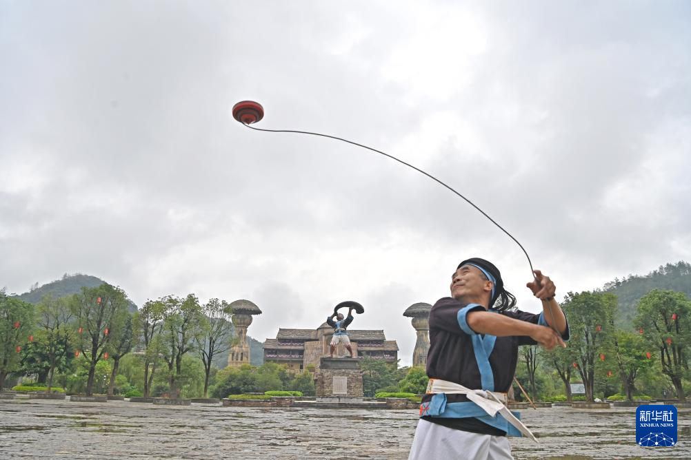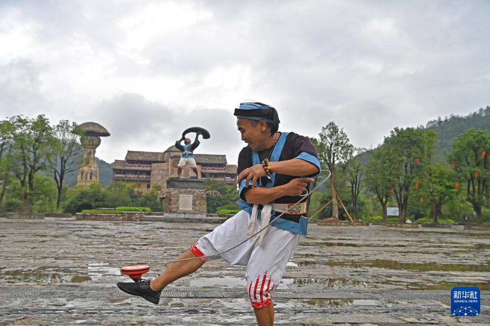 何光斌在南丹县里湖瑶族乡朵努社区展示空中放陀螺(8月30日摄)。