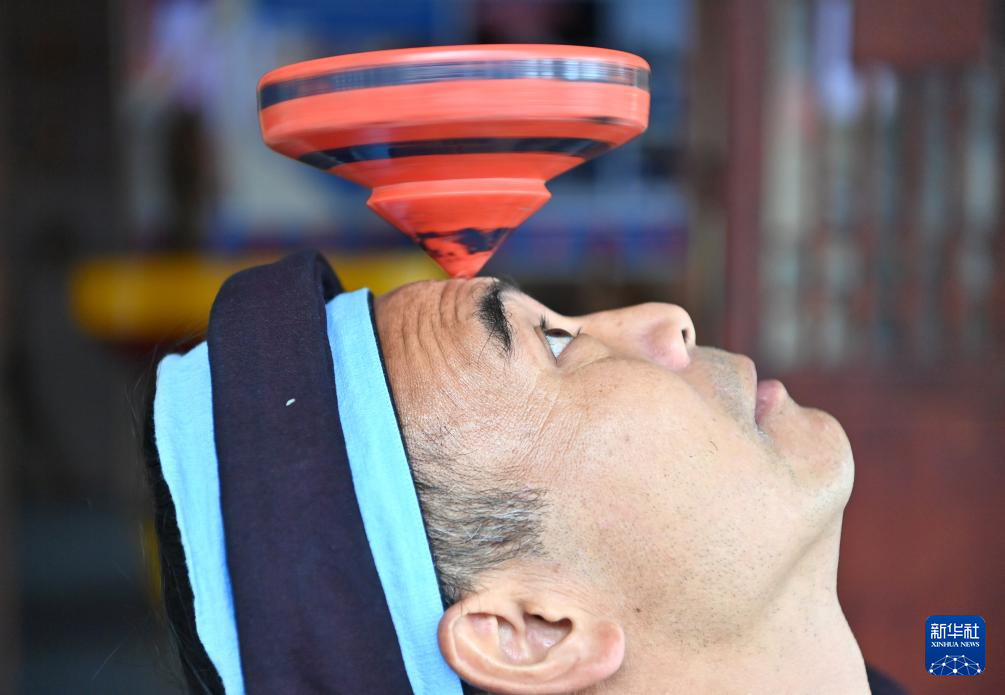 何光斌在南丹县里湖瑶族乡朵努社区展示陀螺在额头上旋转(8月30日摄)。