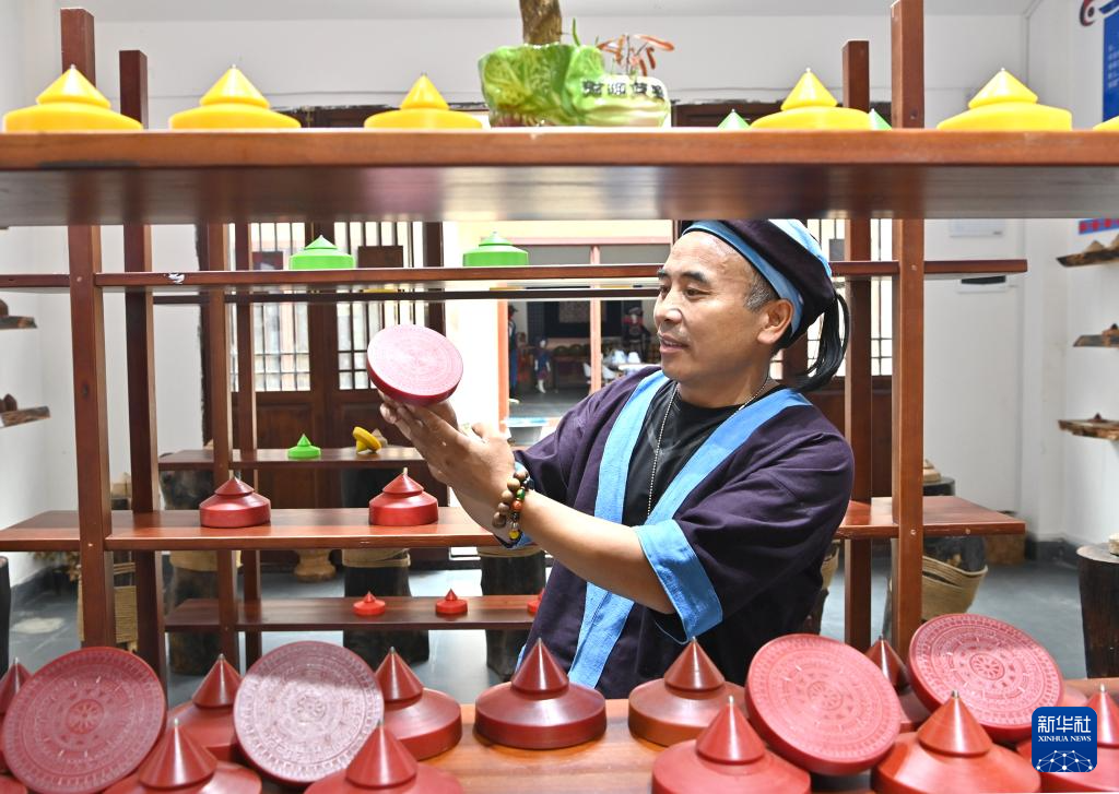 何光斌在南丹县里湖瑶族乡朵努社区展示花样陀螺(8月30日摄)。
