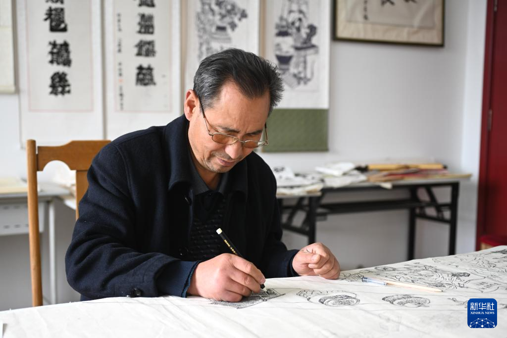 10月31日,杨佳年在隆德县杨氏彩塑艺术馆设计彩塑图案。