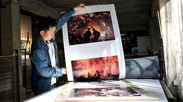 12月9日,在云南普洱学院那柯里绝版木刻教学实践基地,基地负责人、绝版木刻画家冷光冕展示印好的作品。