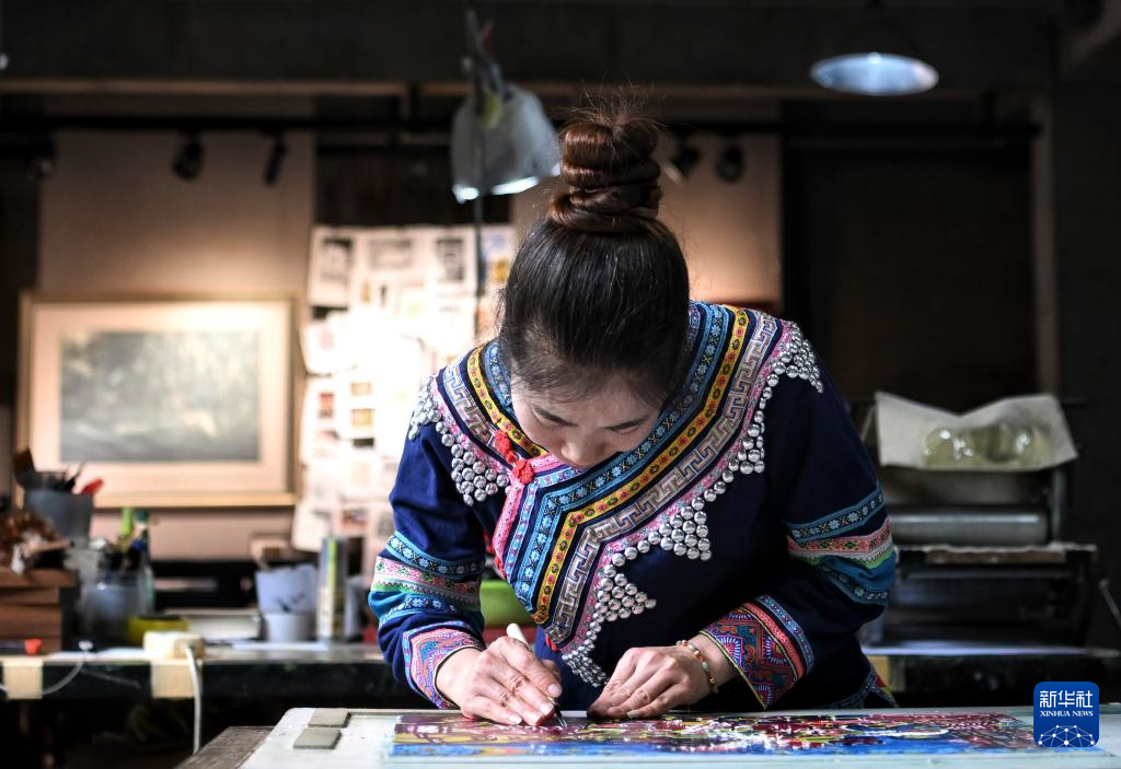 12月9日,在云南普洱学院那柯里绝版木刻教学实践基地,绝版木刻画师在进行版画创作。