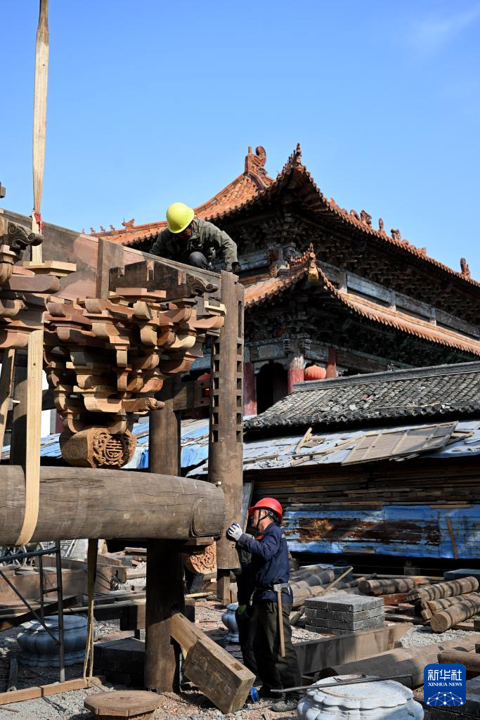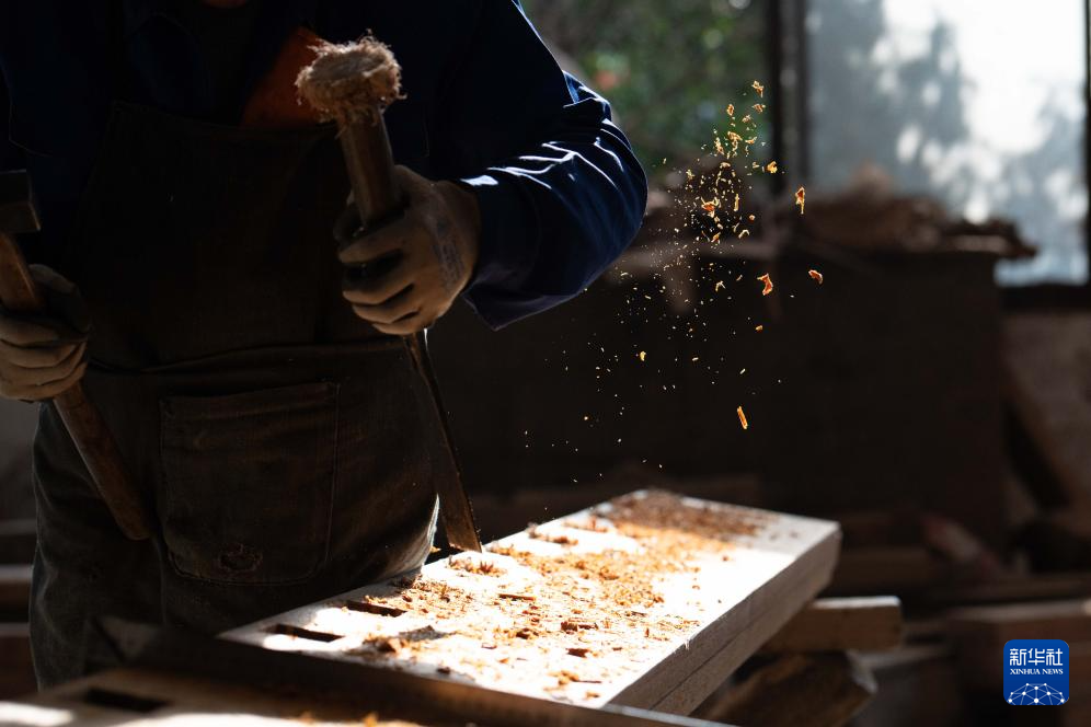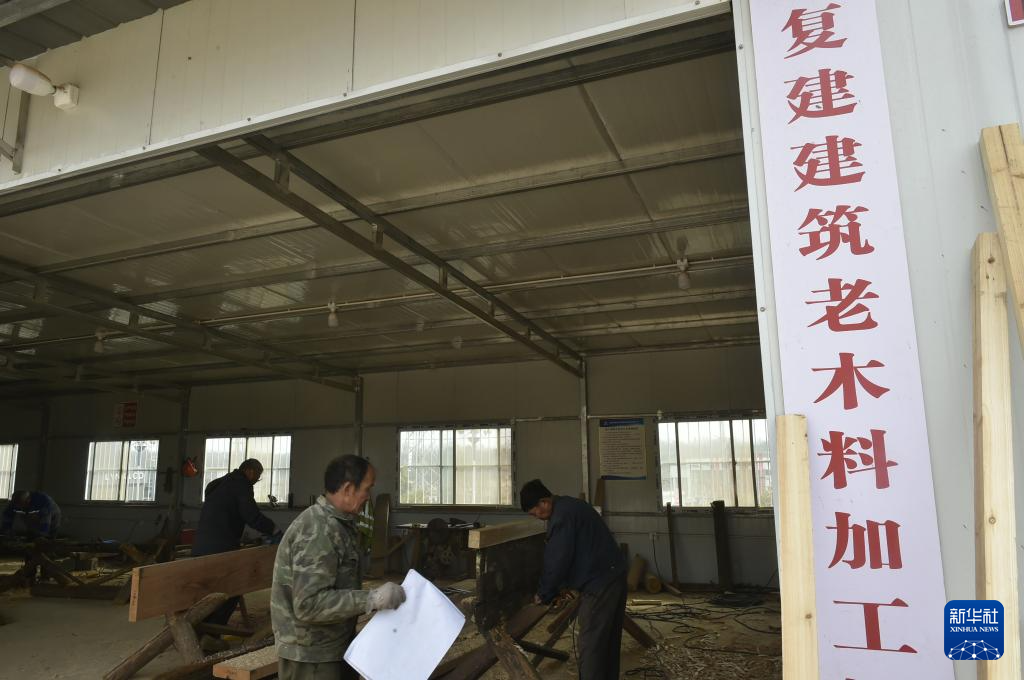 1月8日,在安徽省黄山市休宁县,工人在一处传统徽派古民居复建工地现场进行木料加工。