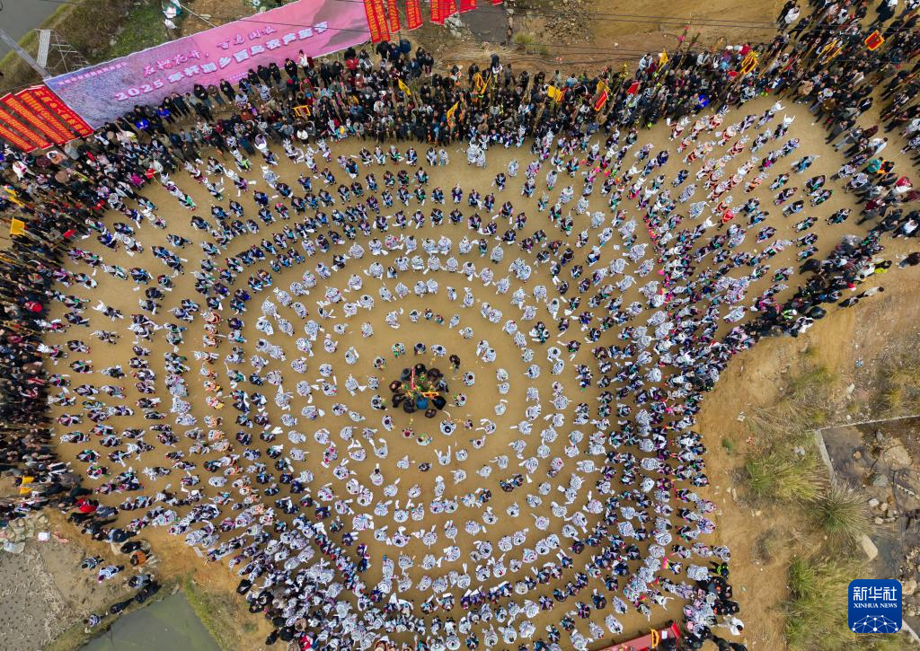 2月5日,在广西融水苗族自治县杆洞乡百鸟衣芦笙坡会上,各族群众一起跳芦笙踩堂舞(无人机照片)。