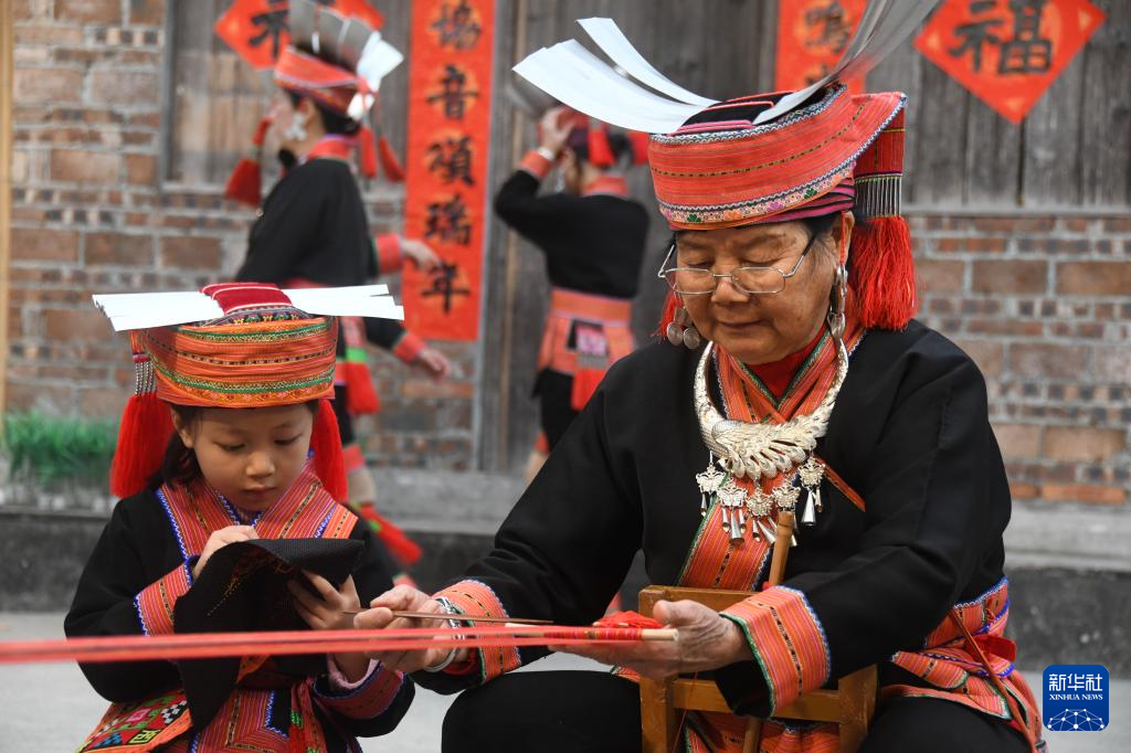 3月28日,在广西来宾市金秀瑶族自治县,孩子在长辈的带领下制作“三月三”服饰。