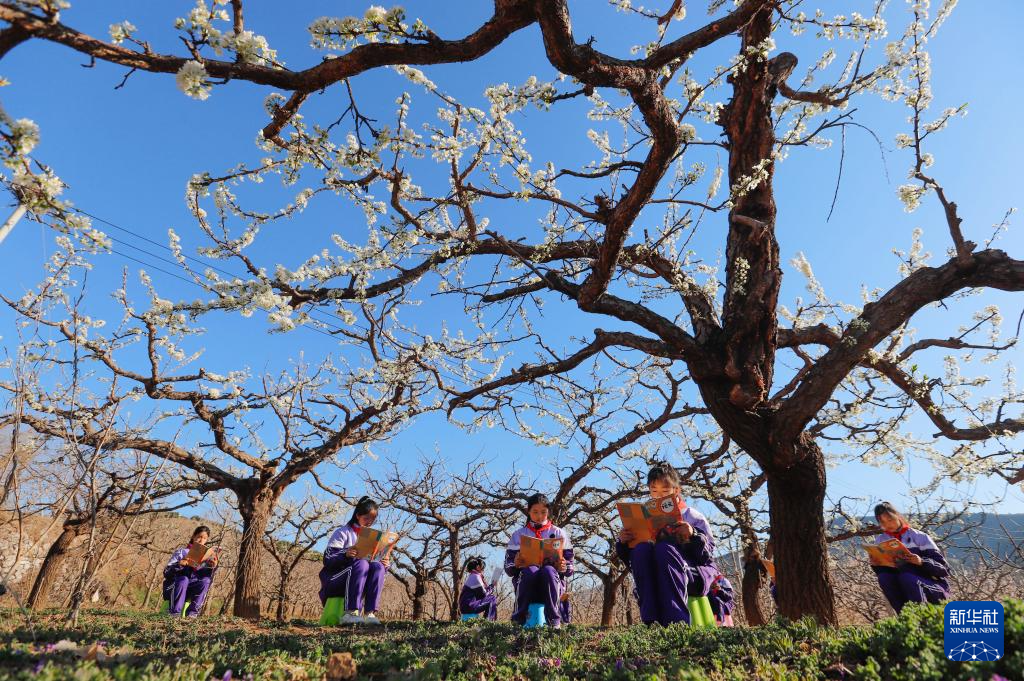 4月2日,河北省遵化市地北头镇鲁家峪九年一贯制学校组织开展读书日活动,朗读社团学生在果园读书。