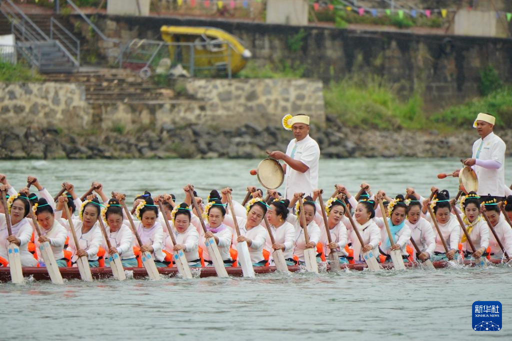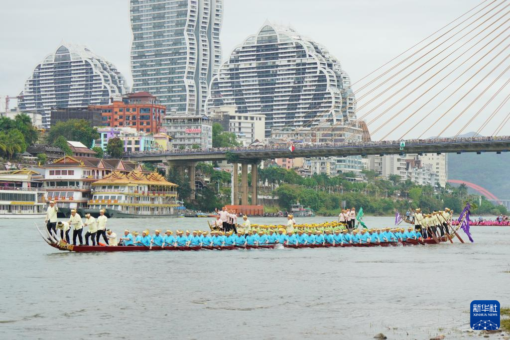 4月13日,在西双版纳傣族自治州景洪市,人们参与传统龙舟表演赛。