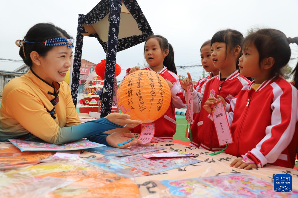 9月28日,在山东省滨州市沾化区冯家镇李家幼儿园,孩子们在“拾趣品中秋 童心迎国庆”活动上猜灯谜。