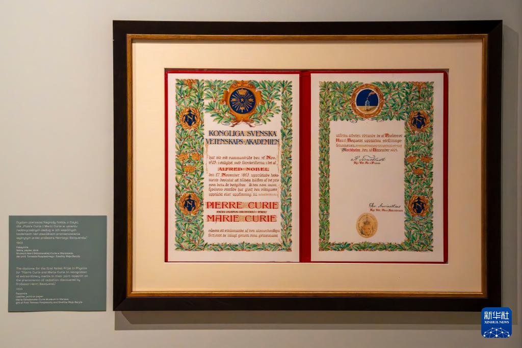 这是10月7日在波兰华沙的玛丽·斯克洛多夫斯卡-居里博物馆拍摄的居里夫人1911年获得诺贝尔化学奖的证书复制品。