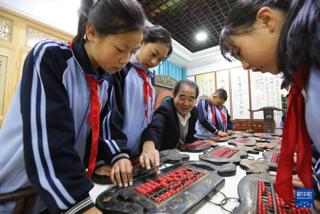 10月14日,陇西县红星小学学生在程万里的算盘非遗体验基地参观。