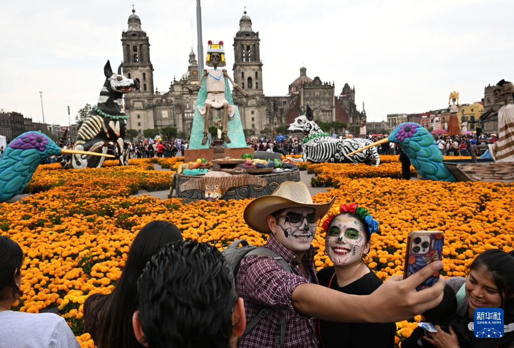 11月1日,在墨西哥首都墨西哥城,民众观看亡灵节游行并自拍留影。