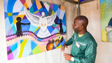 1月24日,在喀麦隆首都雅温得举行的世界非洲和非洲裔文化日庆祝活动上,一名艺术家展示绘画作品。