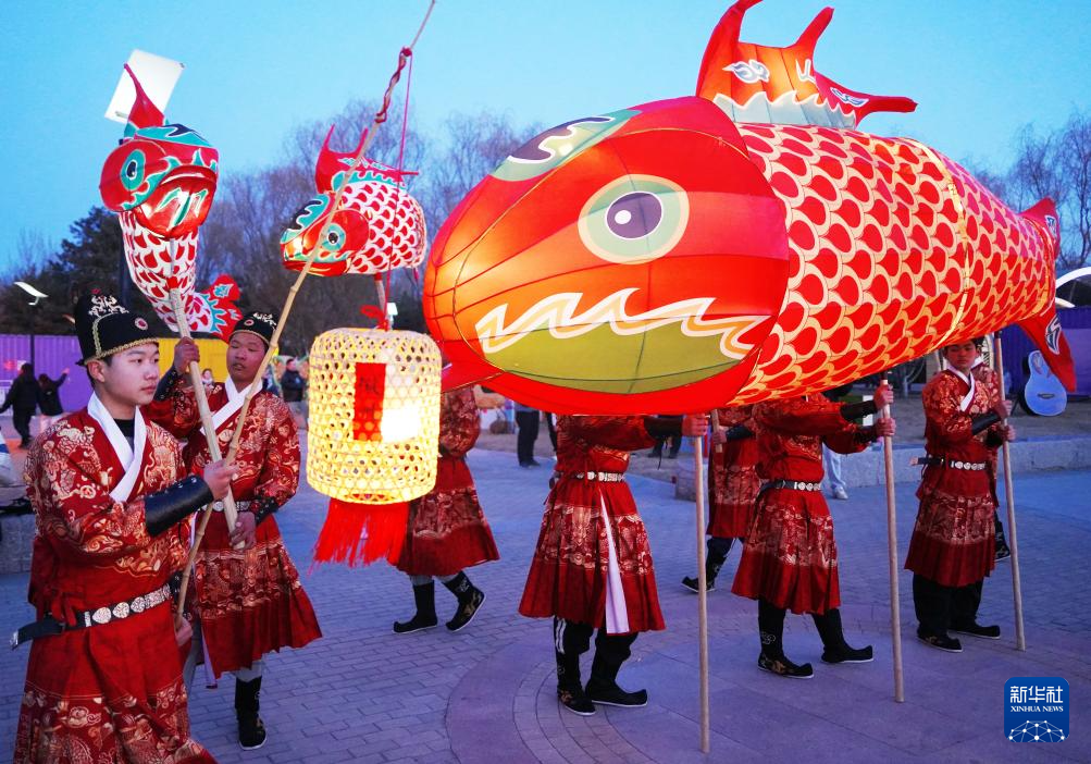 2月10日,演员在台湖公园展示非遗鱼灯巡游。