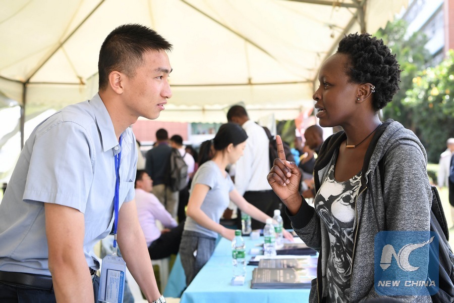 Recruiting representatives of Chinese firms talk to job seekers at a job fair for Kenyan students hosted by the Confucius Institute of the University of Nairobi on Dec. 20, 2017.(Xinhua/Chen Cheng)
