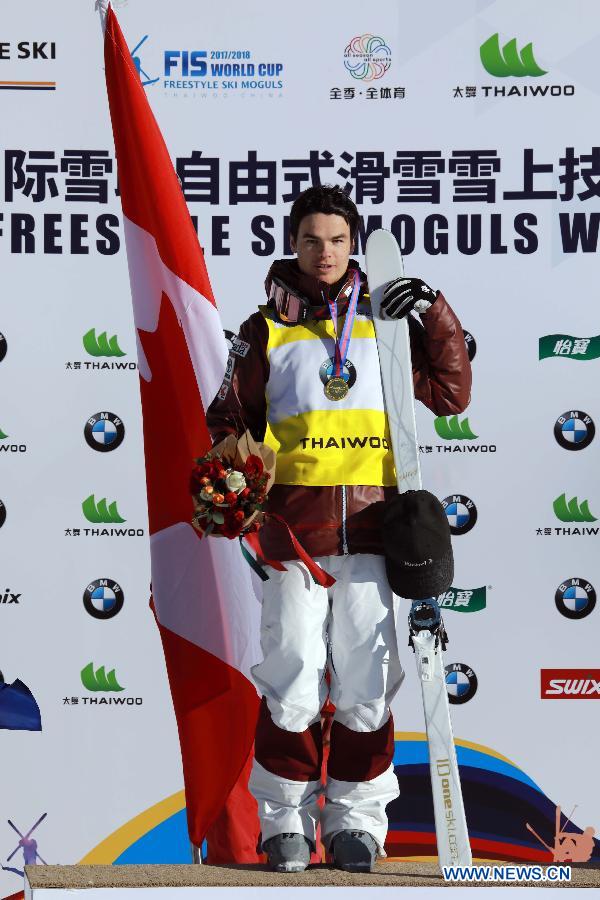 Winner Mikael Kingsbury of Canada poses on the podium after winning the men's Moguls on the Day 1 of the 2017-2018 Freestyle Skiing WorldCup-Moguls & Aerials at the Thaiwoo ski resort in Chongli District of Zhangjiakou City, north China's Hebei Province, Dec.21, 2017. (Xinhua/Meng Jing)