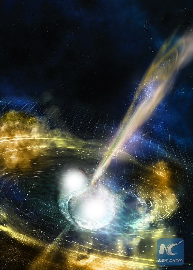 Illustration Image shows two merging neutron stars. The narrow beams represent the gamma-ray burst while the rippling spacetime grid indicates the isotropic gravitational waves that characterize the merger. Swirling clouds of material ejected from the merging stars are a possible source of the light that was seen at lower energies. Scientists announced Monday that they have for the first time detected the ripples in space and time known as gravitational waves as well as light from a spectacular collision of two neutron stars. (Xinhua/National Science Foundation/LIGO/Sonoma State University/A. Simonnet.)