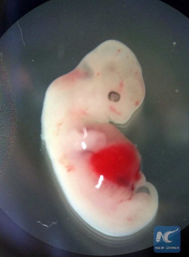 Undated photo released by U.S. Salk Institute on Jan. 26, 2017 shows a 4-week-old pig embryo containing human cells. In a bold but potentially controversial quest for solutions for the worldwide shortage of transplant organs, scientists attempting to grow human organs inside pigs have successfully grown the first chimera embryos containing cells from both humans and pigs, they said Thursday. (Xinhua/U.S. Salk Institute)