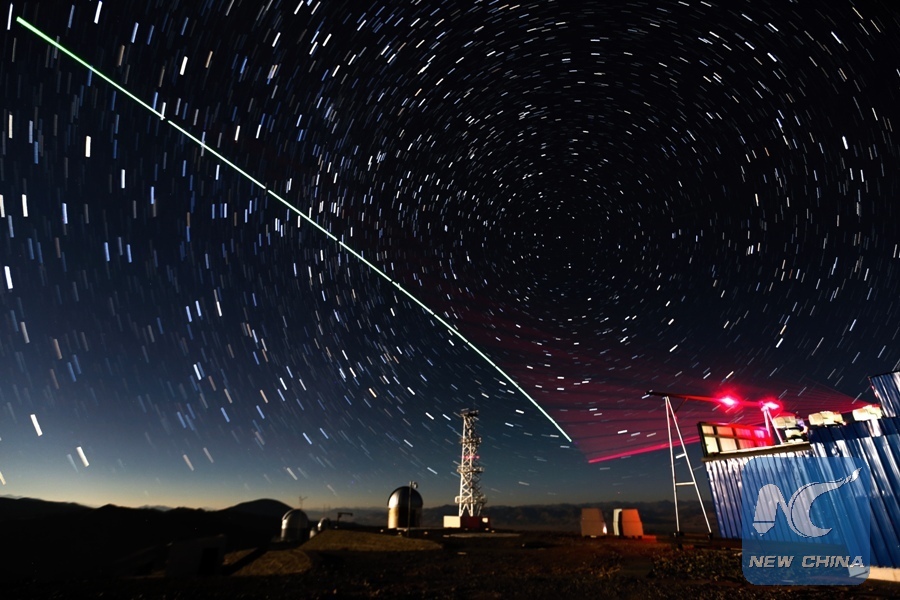Composite photo taken on Dec. 9, 2016 shows a satellite-to-earth link established between quantum satellite "Micius" and the quantum teleportation experiment platform in Ali, southwest China's Tibet Autonomous Region. (Xinhua/Jin Liwang)