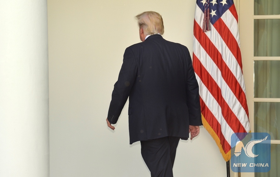 U.S. President Donald Trump leaves after delivering a speech at the White House in Washington D.C., capital of the United States, on June 1, 2017. U.S. President Donald Trump said on Thursday that he has decided to pull the United States out of the Paris Agreement, a landmark global pact to fight climate change. (Xinhua/Mike Theiler)