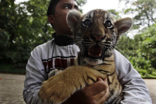 Zookeeper holds a cub of Bengal Tiger in Bandung zoo park, Indonesia, Aug. 29, 2017. (Xinhua/Banyu Biru)