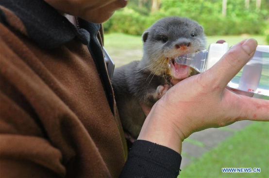 A breeder feeds an Asian small-clawed otter baby in the Singapore Zoo on May 30, 2017. (Xinhua/Then Chih Wey)