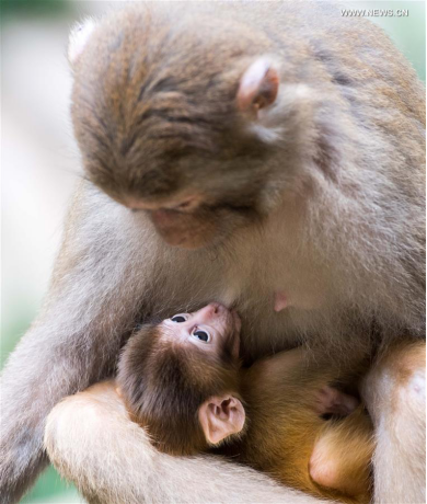 A female monkey feeds its baby in Tongjing scenic spot, a habitat of macaque, in Chongqing, southwest China, June 3, 2017. Macaques in the scenic spot attracted many tourists. (Xinhua/Liu Chan)