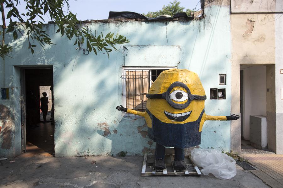 Photo taken on Dec. 29, 2017 shows a "Momo" in front of a house in La Plata, Argentina. As part of a tradition that began in the 1950s, the residents of La Plata make annually giant dolls known as "Momos", with shapes of dinosaurs, superheroes, and cartoon characters, which will be burnt during the first hours of January 1 to celebrate the New Year. (Xinhua/Martin Zabala)