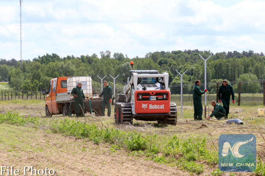Workers install poles for the fence near the Sudargas border crossing point with Russia in Ramoniskiai, Lithuania June 5, 2017. (REUTERS PHOTO)