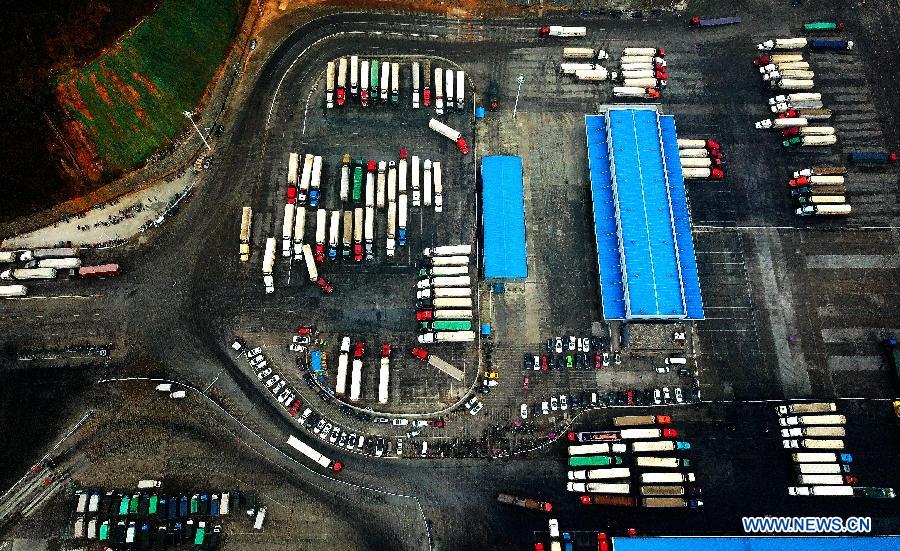 Trucks from ASEAN countries wait at a border supervision center in Pingxiang City of south China's Guangxi Zhuang Autonomous Region, Jan. 16, 2018. By making full use of its geographical location and the potential of coastlines and border areas, Guangxi capitalized on its advantages and played a bigger role in the Belt and Road Initiative. Through ports and the Beibu Gulf Economic Zone, the trade cooperation between Guangxi and ASEAN countries gained great prospects.(Xinhua/Zhang Ailin)
